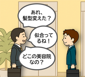 「美容院にしたんだ。似合ってるね!どこの美容院なの?」