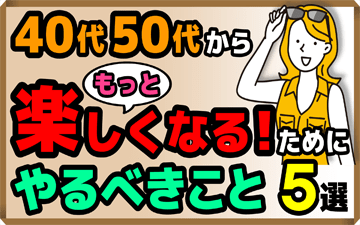 心40代50代から「もっと楽しくなる!」ためにやるべきこと・5選40代50代は、人生のターニングポイントとなる非常に重要な時期。 この時期に、生き方をガラッと変える必要があるんです。 なぜなら、40代から50代にかけて体と心に大きな変化が訪れるからです。 この時期になると、自...